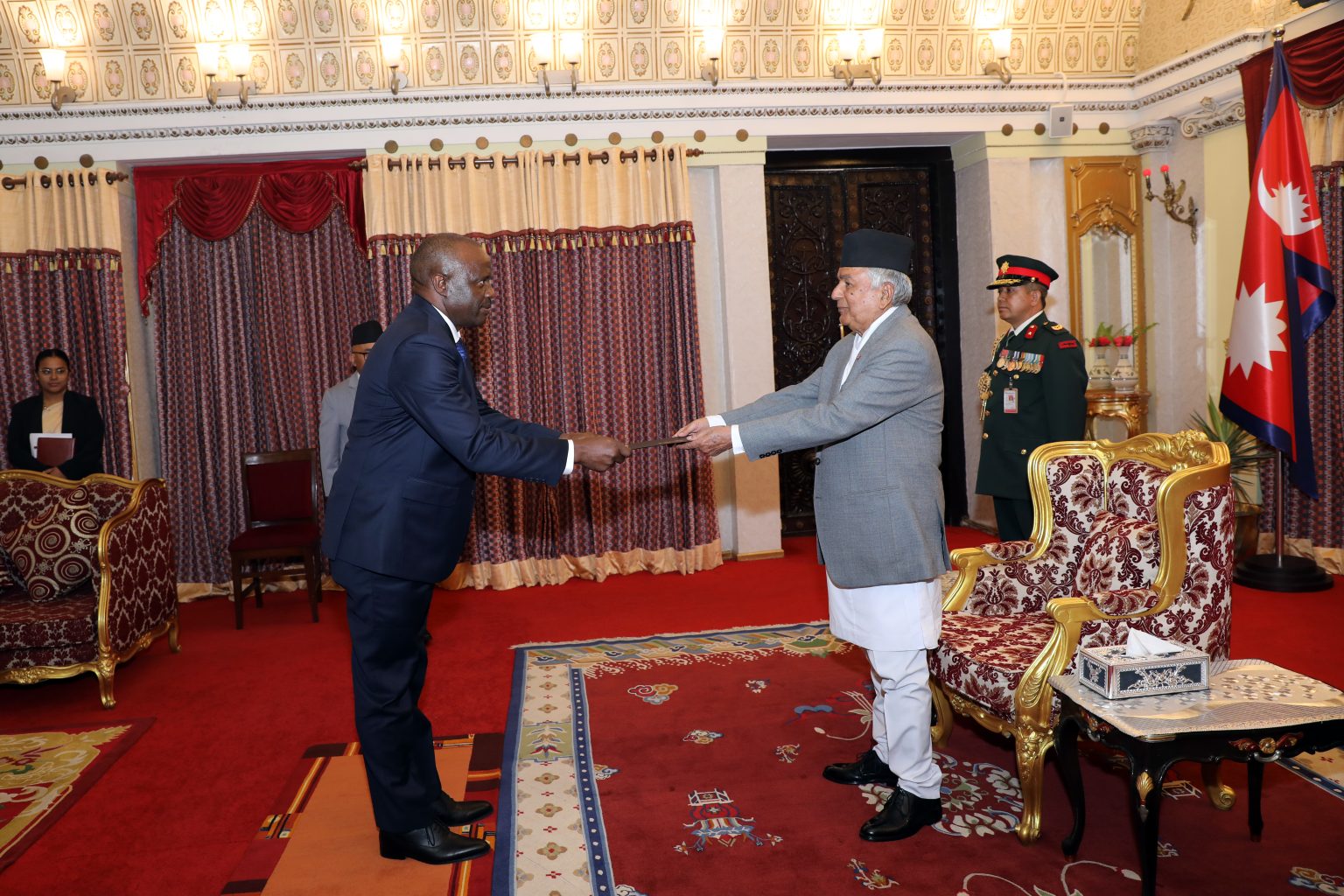 The newly appointed ambassadors of Denmark, Kenya, Jordon, Uruguay and Zimbabwe submitted their respective credentials at separate ceremonies organized at the Sheetal Niwas today, according to the Office of President-Sheetal Niwas.