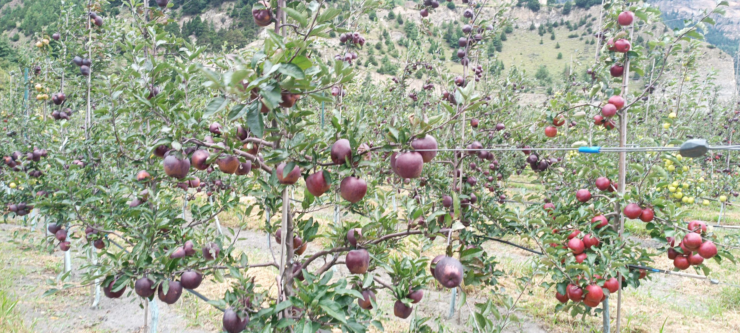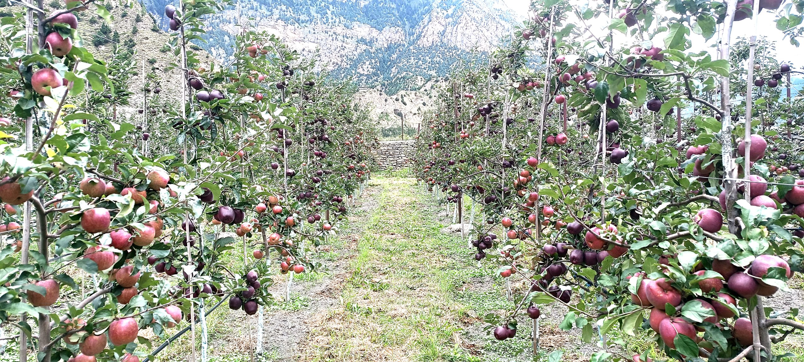 Mustang, Aug 29: Apples ready for harvest at the IPM Apple Farm of farmer Niraj Tulachan in Tukuche village, Thasang Rural Municipality–1, Mustang. His orchard, cultivated under a high-density system, produces Gala, Fuji, and King Red varieties of apples. At present, traders are buying the apples directly from the orchard at Rs. 250 per kilogram.