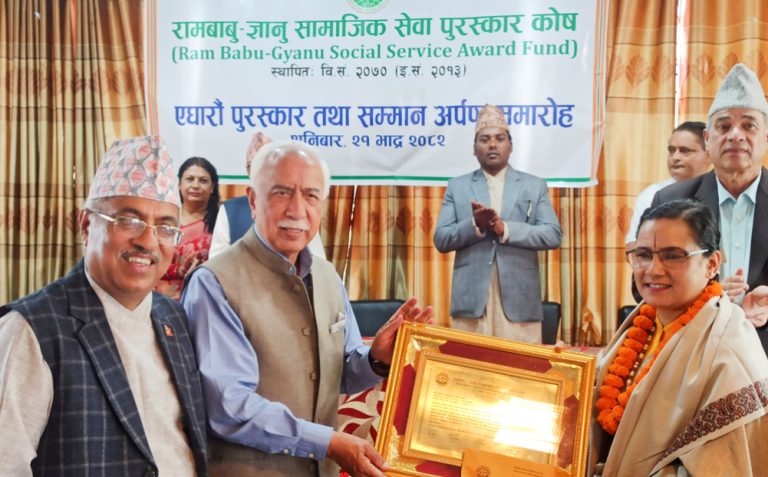 Kathmandu, Sept 6: This year’s Ram Babu-Gyanu Social Service Award was presented to Manab Kalyan Samaj (Service Home), based in Bhaktapur. Former Vice Chancellor of Tribhuvan University, Kedar Bhakta Mathema, conferred the award which carries a purse of Rs 200,000 on Sumitra Chaulagai (Sumi Manab), the founder of the organization,