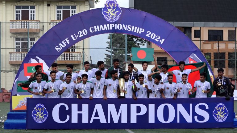 Kathmandu, Aug 28: Bangladesh has been crowned the new champion of the SAFF (South Asian Football Federation) U-20 Championship football tournament. Bangladesh won the title by defeating hosts Nepal by 4-1 in the final match held today at the All Nepal Football Association (ANFA) ground in Satdobato, Lalitpur, For Bangladesh,