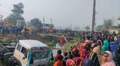 Three minors died and a woman got injured when a lorry overturned in a road off the main highway at