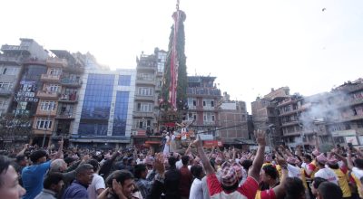 The chariot of Rato Machhindranath (also known as Matsyendranath) has been pulled to Ga:bahal.