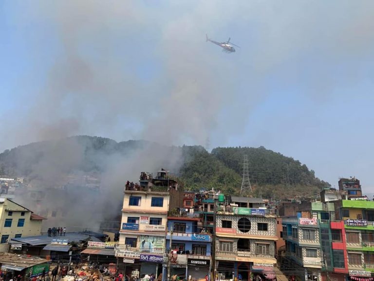 A huge fire broke out at a main chowk of Damauli of Byas municipality-4 in Tanahu has yet to be taken under control. The fire had started at 10:00 am today from a warehouse of local Bhupal Hardware. Until the filing of this report, firefighters from the Byas municipality and