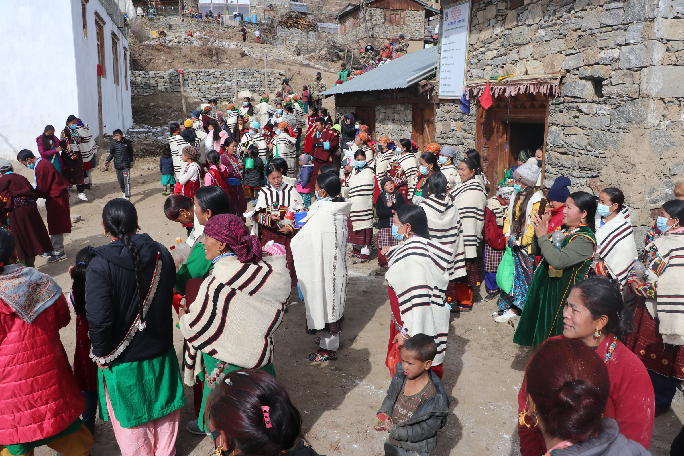 Women from the Lama community dressed in traditional garb celebrating the final day of the Lhosar festival in Humla, on Thursday. (Photo: Dane Bohora/RSS)
