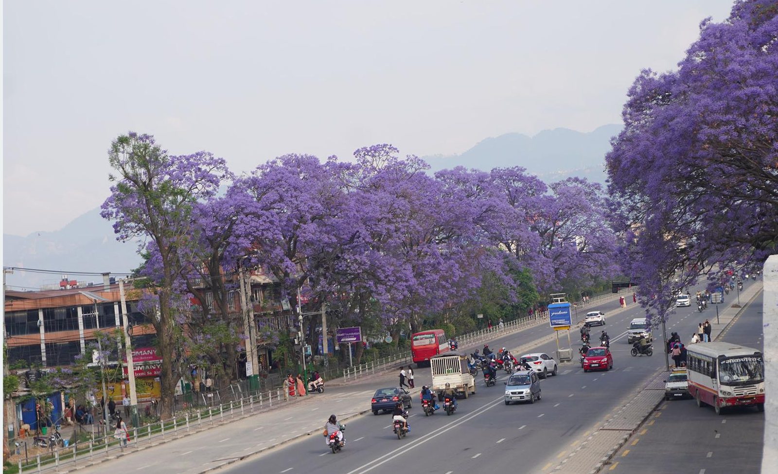 Kathmandu, May 9: A section of the Ring Road along Lalitpur Metropolis-14 these days offers an enchanting sight of the blooming jacaranda trees that line up along it. The place is vibrant with shades of lavender, capturing the attention of passersby.