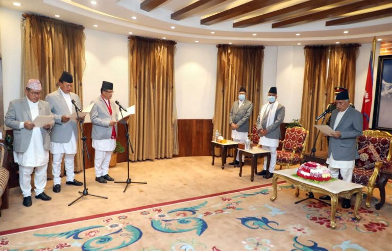 Kathmandu, May 4: Newly appointed ministers: Dhanraj Gurung, Minister for Law, Justice and Parliamentary Affairs; Mohan Bahadur Basnet, Minister for Health and Population and Dig Bahadur Limbu, Minister for Youth and Sports, took an oath of office and secrecy today before President Ramchandra Paudel. The oath-taking ceremony was held at