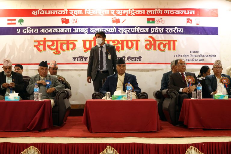 Dhangadhi: Nepali Congress President and Prime Minister Sher Bahadur Deuba has said the five-party ruling alliance was formed to safeguard the Constitution, the democratic republic, federalism and for the development and prosperity of the nation. In his address to a joint province-level party gathering organised by the alliance at Dhangadhi