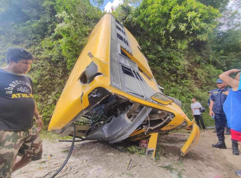 Pokhara, July 29: Two people were killed and 28 others injured when a school bus met with an accident in Pokhara, Kaski today. The bus (registration number Ga 1 Ka 6219) was carrying students of the LP Devkota Memorial School based at Birauta, Pokhara-17. It fell 50 metres down from