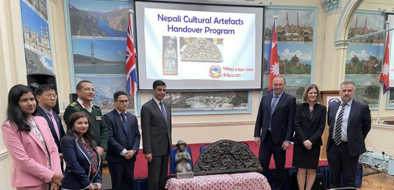 The United Kingdom (UK) has handed over two artistic cultural artifacts that were disappeared from Nepal. At a programme organized at London-based Nepali Embassy on Friday, Detective Superintendent Head of London Metropolitan Police Office, John Roch handed over the lost heritages to Nepal's Ambassador to the UK, Gyan Chandra Acharya.