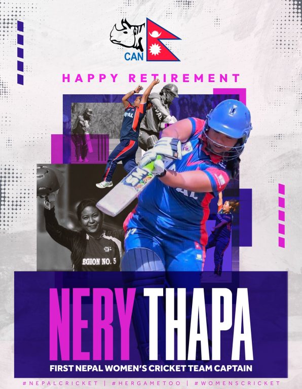 Nepalgunj, March 19: The first captain of the Nepali National Women's Cricket Team, Nery Thapa, has announced retirement from cricket. She made the announcement through the social media. A resident of Nepalganj sub-metropolitan city, Thapa played cricket for almost 17 years. Nepali was the capital of the Nepali National Women's