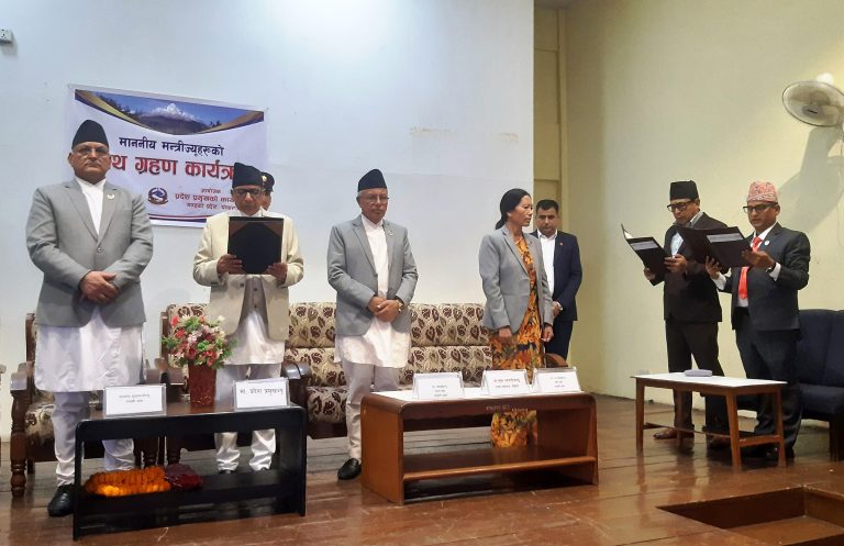 Gandaki, June 11: Newly appointed ministers of Gandaki Province government, Rajeev Gurung (Deepak Manange) and Phanindra Devkota have taken oath of office and secrecy. Amidst a programme organised at a meeting hall of Gandaki Province-based Nepal Tourism Board today, Province Chief Dilli Raj Bhatta administered oath of office and secrecy