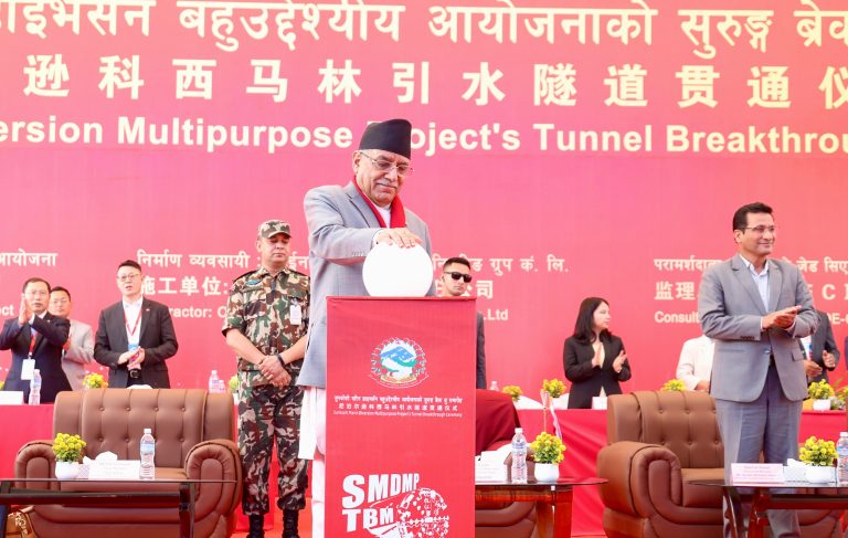 Kathmandu, May 8: The Sunkoshi-Marin multipurpose diversion tunnel have been successfully broke through today. Prime Minister Puspa Kamal Dahal, including ministers, diplomats, parliamentarians witnessed the break through event. On the occasion, Prime Minister Dahal has said that it will contribute qualitatively to the national economy after its implementation. At the