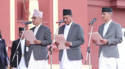 President Ramchandra Paudel administered the oath of office and secrecy to ministers- Rameshwor Khanal, Kulman Ghising, and Om Prakash Aryal-