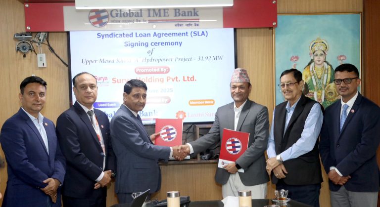 Kathmandu, June 13: A Syndicated Loan Agreement (SLA) has been signed for the 32-MW Upper Mewa Khola Hydropower Project under the leadership of Global IME Bank Limited. The agreement was signed between the project’s promoter company, Saurya Holdings Pvt. Ltd., and the bank for financial management. As per the agreement,