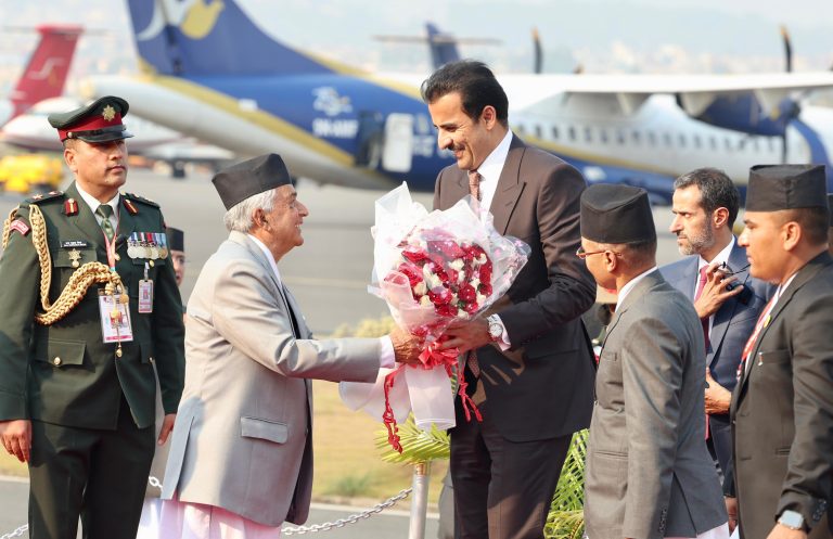Kathmandu, April 23: The Emir of the State of Qatar, Sheikh Tamim bin Hamad Al Thani, arrived here on a two-day State visit to Nepal at the friendly invitation of President Ramchandra Paudel. He landed here at Tribhuvan International Airport (TIA) this afternoon. Upon arrival at TIA, President Paudel welcomed