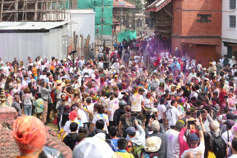 Kathmandu, March 24: People have thronged in Basatapur, the heart of Kathmandu to celebrate Holi or Fagu. Thousands of youths have been taking part the festival and exchanging different types of colours. Even, the music and dance have added the atmosphere more entertaining and lively. Foreign tourists who have come