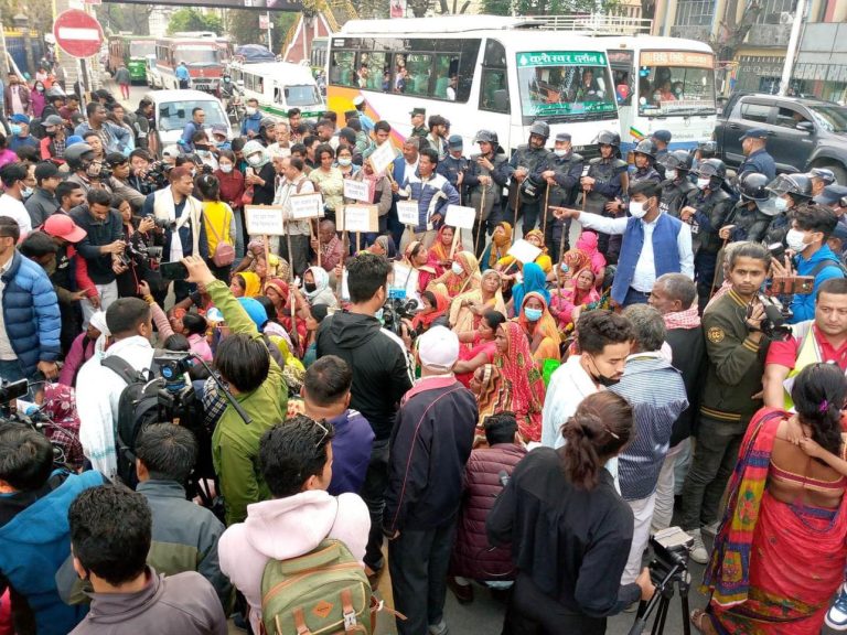 Kathmandu, March 27: The loan sharking (also known as 'meter interest') victims, who came to Kathmandu after walking for 11 days, demonstrated Monday afternoon in front of the Open Theater (Tundikhel Khulamanch). They came from different districts of Terai-Madhes and demonstrated in front of Khulamanch gate. Although the victims tried