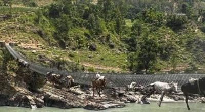 Achham, June 9: Eleven of the 13 mules stuck in the middle of a suspension bridge over the Karnali river