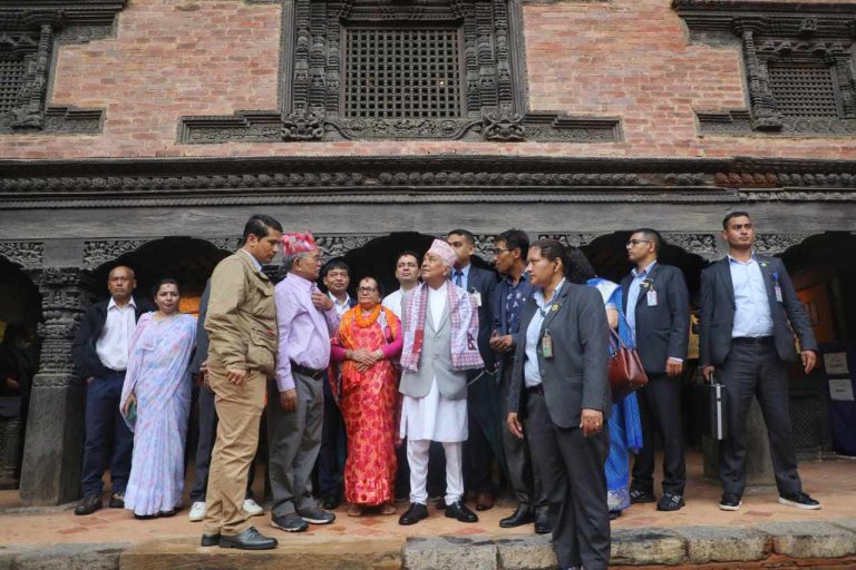 President Ram Chandra Paudel today morning visited the Patan Durbar Square, Lalitpur. He was taking rest after being sick for a long time, and was not present in the public programs. Lalitpur Metropolitan Mayor Chiribabu Maharjan and other high level officials of the Metropolis received President Paudel.