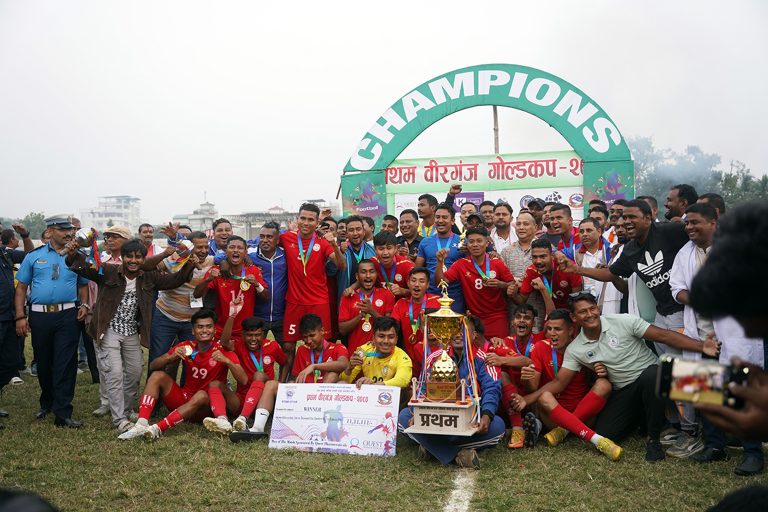Birgunj, Nov 11: The Nepal Police Club has clinched the title of the First Birgunj Gold Cup 2080 held in Birgunj. The Club won the title by defeating another departmental team, the Tribhuvan Army Club, by 2-0 in tiebreaker in the final match held on Saturday under the championship. With