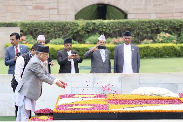 New Delhi, June 1: Prime Minister Pushpa Kamal Dahal 'Prachanda' has offered a wreath at the Samadhisthal of Mahatma Gandhi at Rajghat. Prime Minister Dahal arrived at Rajghat to pay special tribute to Gandhi, who is known as the precursor of peace and non-violence not only in India but across