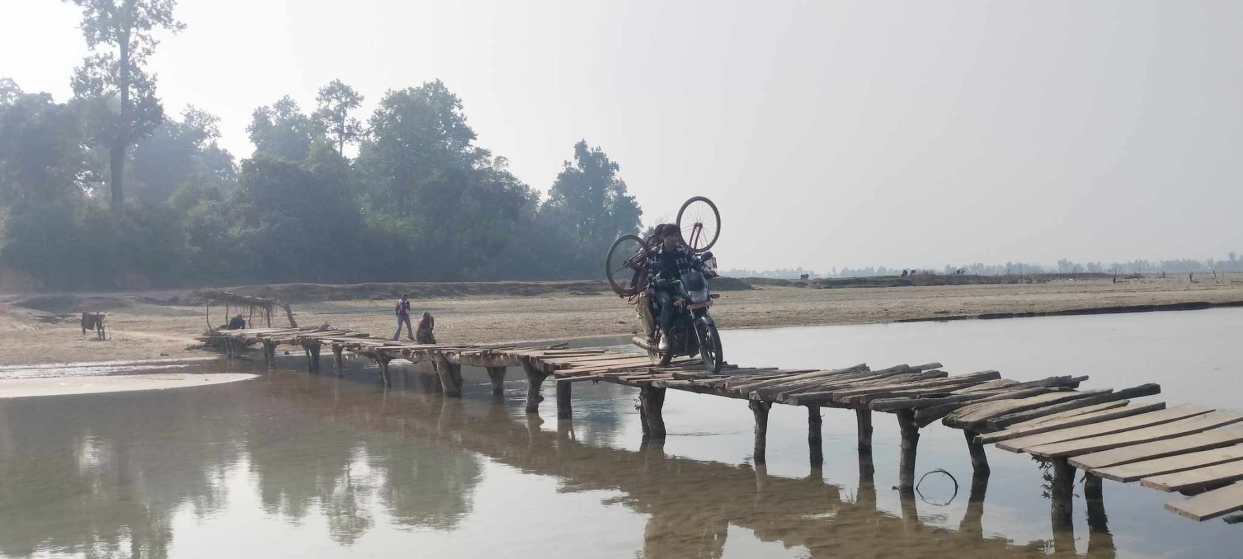 In absence of concrete bridge to cross the river, local folks have been bearing the costs for moving through the temporary wooden bridge.