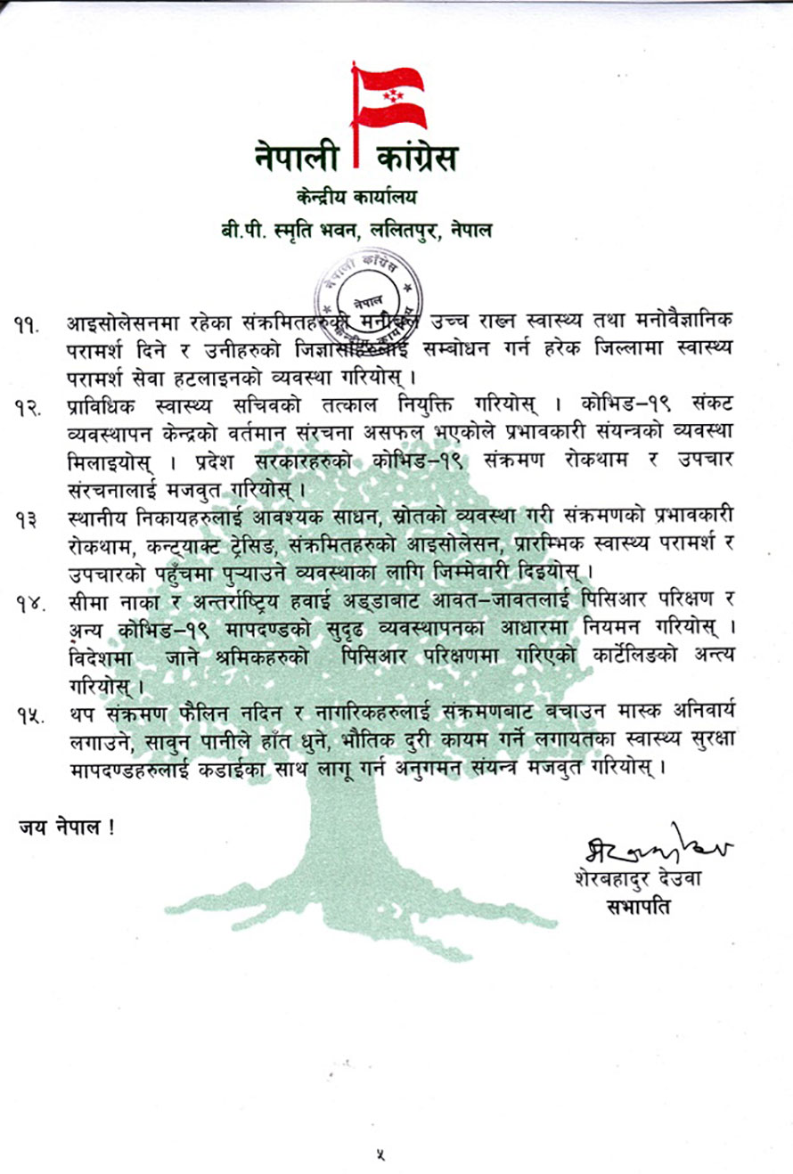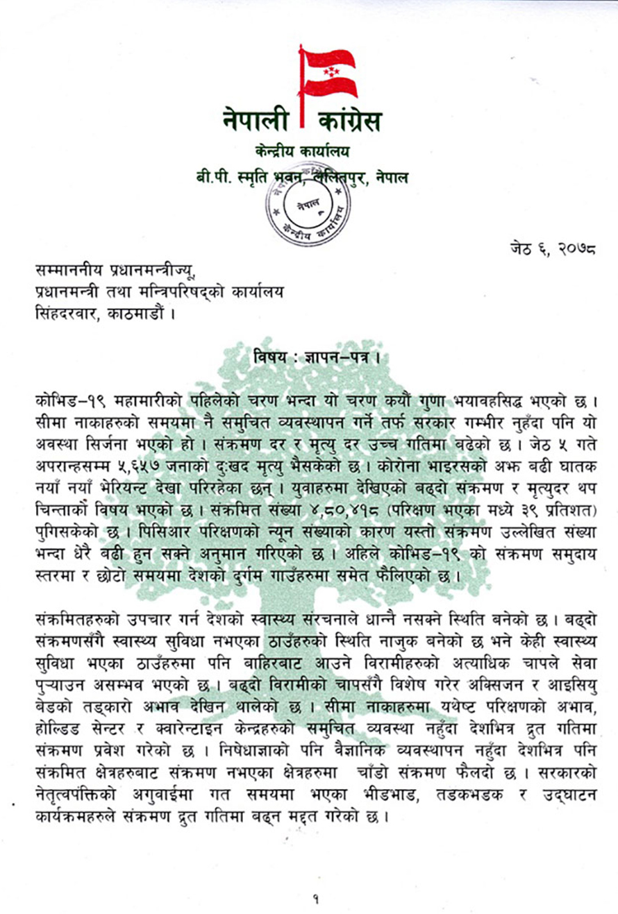 KATHMANDU: The main opposition party, Nepali Congress, has handed over a 15-point memorandum to Prime Minister KP Sharma Oli on coronavirus prevention, treatment and control. After reaching Singha Durbar, President of Nepali Congress Sher Bahadur Deuba handed over the letter to Prime Minister Oli.