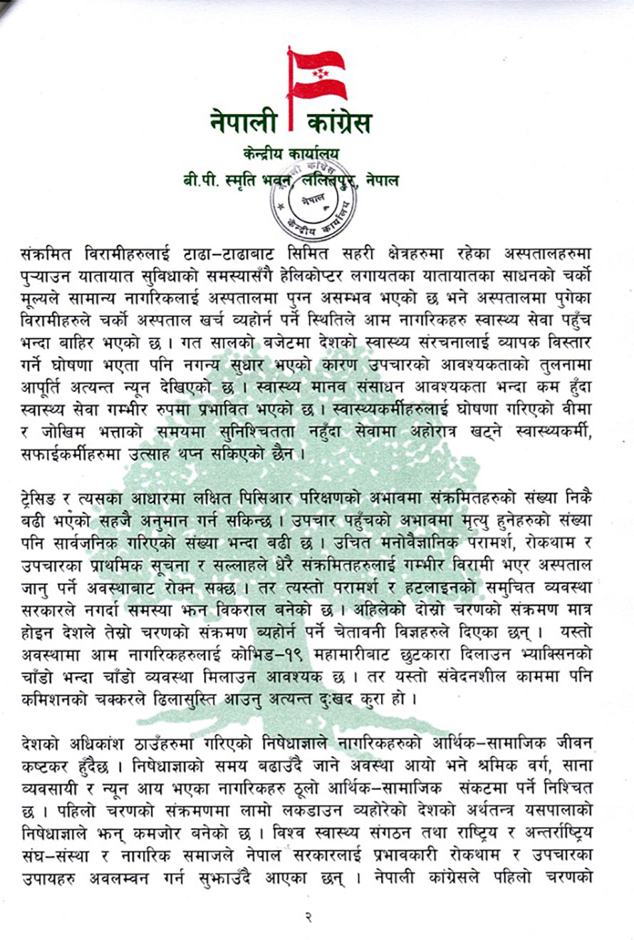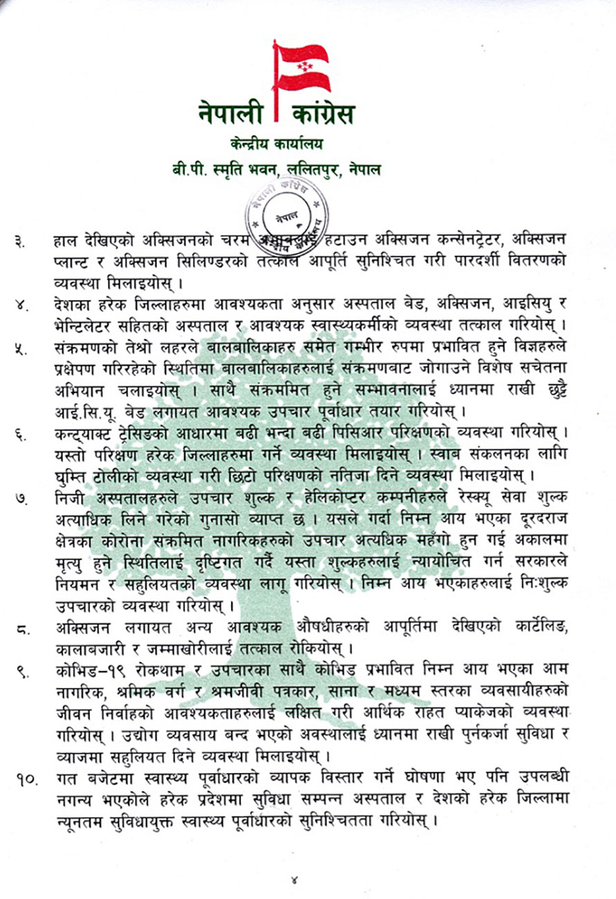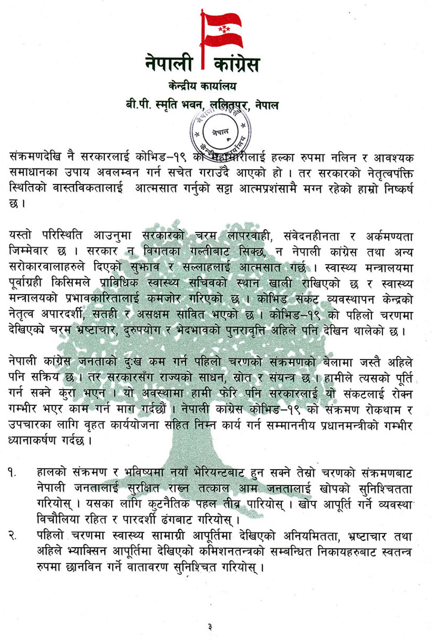 The Congress has pointed out the weakness of the government in handling the second phase of the pandemic in Nepal. Despite the threat of the pandemic, the government was active to organizing big rallies, pageants and inaugurating projects. Congress alleges that such activities have caused accelerating the virus.