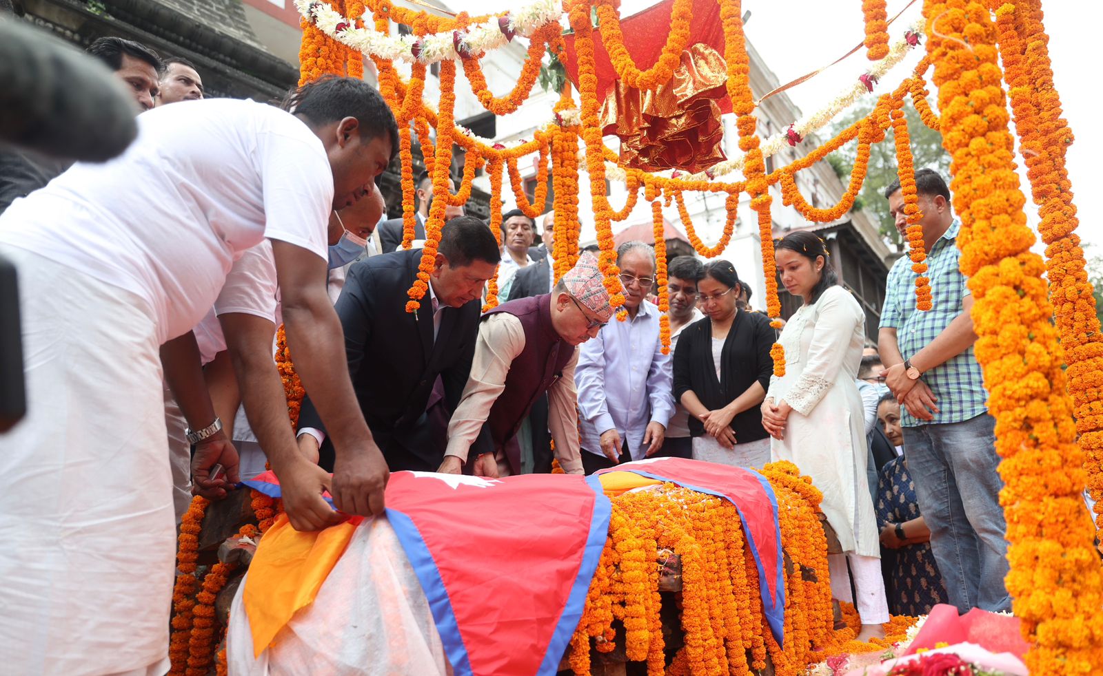 The national flag of Nepal was draped over the mortal remains of Sita Dahal as a final tribute. Prime Minister Dahal lit her funeral pyre. Late Dahal’s daughters Renu Dahal and Ganga Dahal also joined their father in the last rites rituals of their mother.
