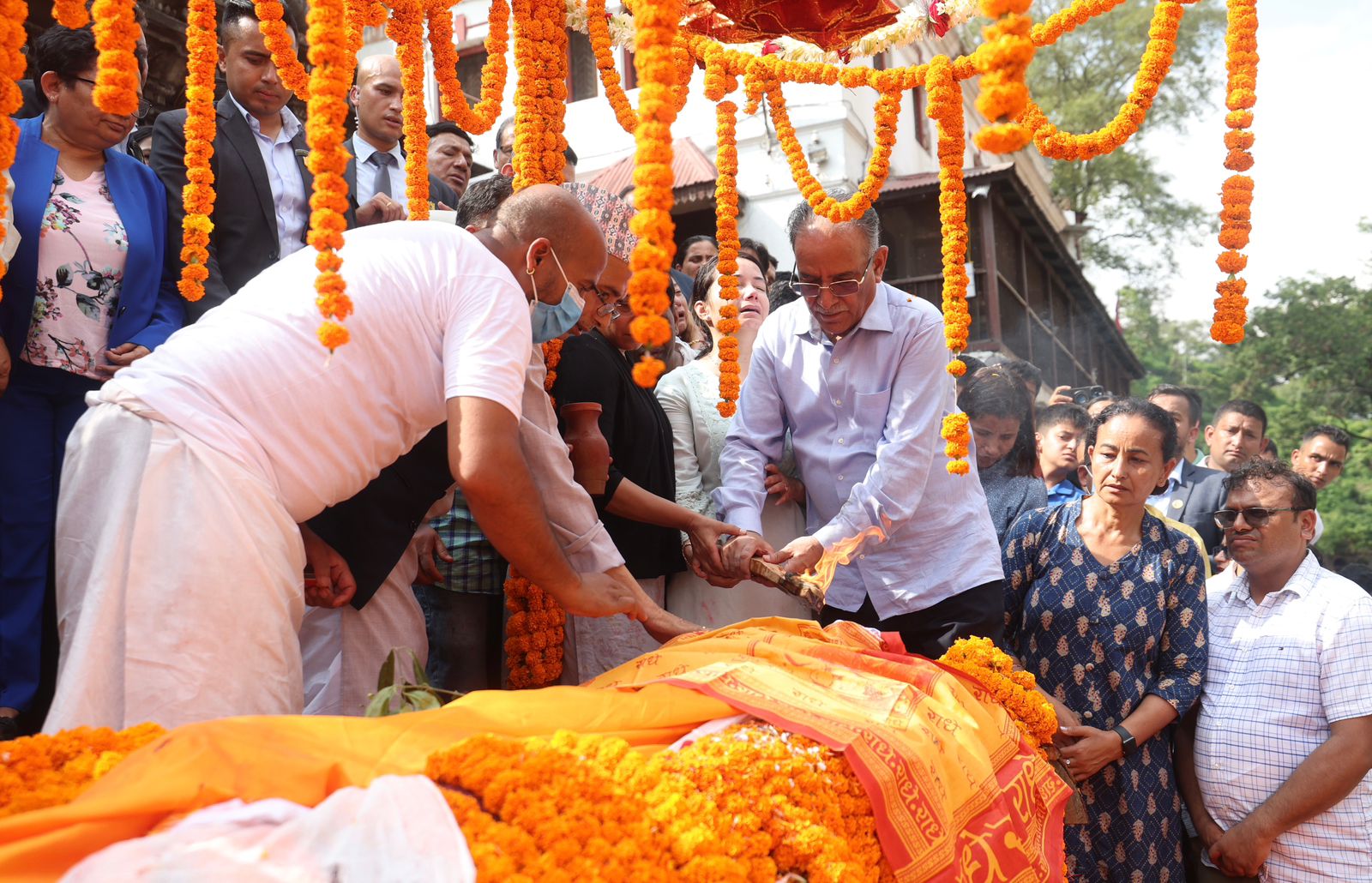 The national flag of Nepal was draped over the mortal remains of Sita Dahal as a final tribute. Prime Minister Dahal lit her funeral pyre. Late Dahal’s daughters Renu Dahal and Ganga Dahal also joined their father in the last rites rituals of their mother.