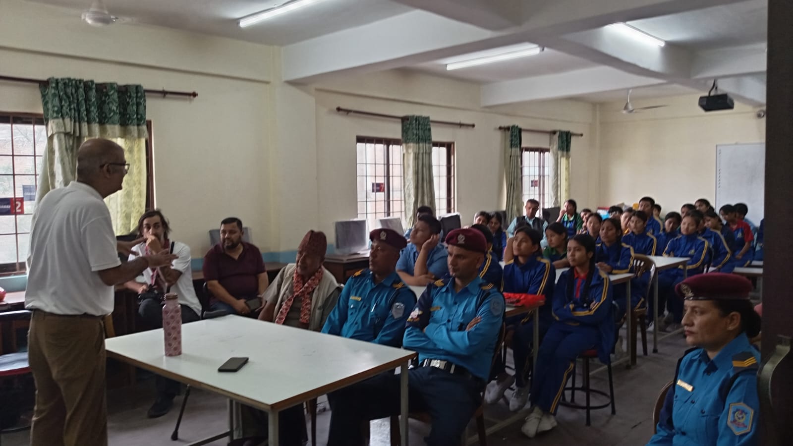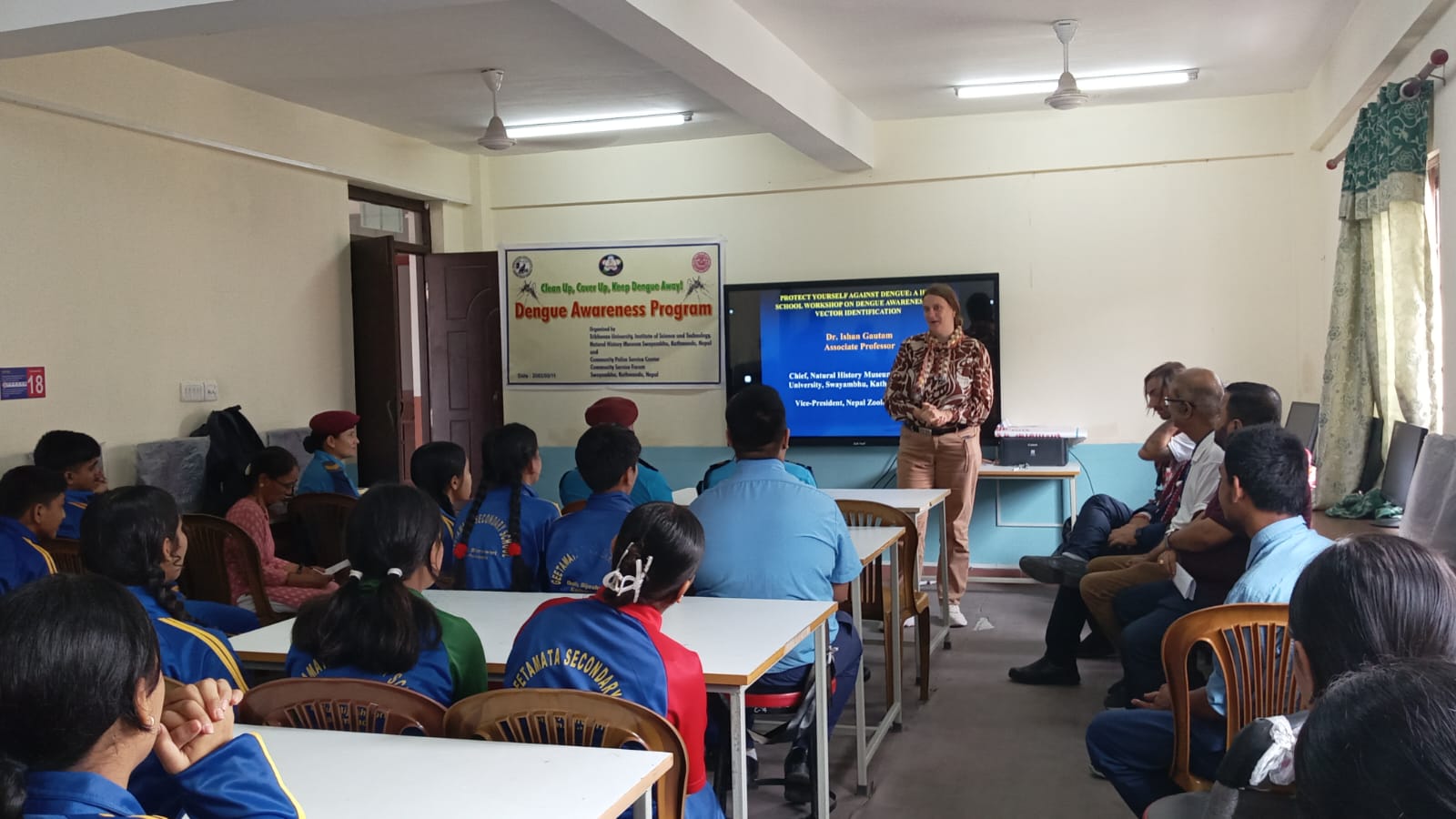 In the program, Associate Professor Dr. Ishan Gautam of the Natural History Museum, Swayambhu, provided awareness training to the students and teachers of Geetamata Secondary School. He shared information on how to prevent dengue infection and the importance of adopting precautionary measures in advance. Dr. Gautam is the researcher who first identified dengue-carrying mosquitoes in Kathmandu.
