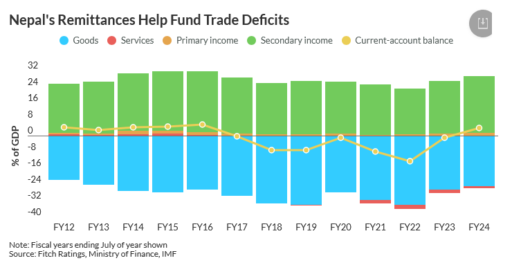 Robust External Liquidity: Nepal’s foreign-exchange reserve coverage increased to 13.5 months of current external payments in FY25, well above the ‘BB’ peer median of 4.8 months. We expect the reserves to continue providing a substantial liquidity buffer against external vulnerabilities and support the longstanding Indian rupee peg. Nepal maintained a net external creditor position of 13.5% of GDP in FY25, in contrast to the ‘BB’ median debtor position of about 12%.