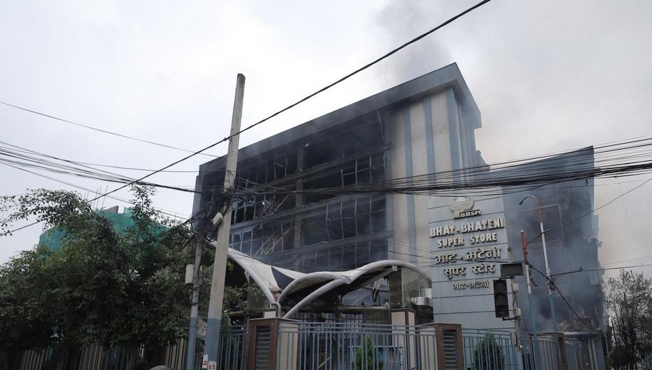 As the GenZ protest was intense, an anarchic group had sprinkled petrol on the store and set it on fire at 7:00pm. The blaze was doused next morning.#nepal #Bhatbhateni supermarket #rss