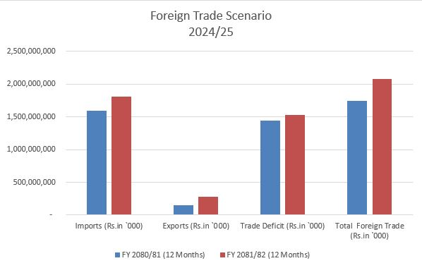 Compared to the previous fiscal year 2080/81, imports rose by 13.25%, and exports increased by a significant 81.80%. Total foreign trade grew by 19.24%, while the trade deficit increased by 6%. Imports made up 86.69% of total trade, with exports accounting for only 13.31%.