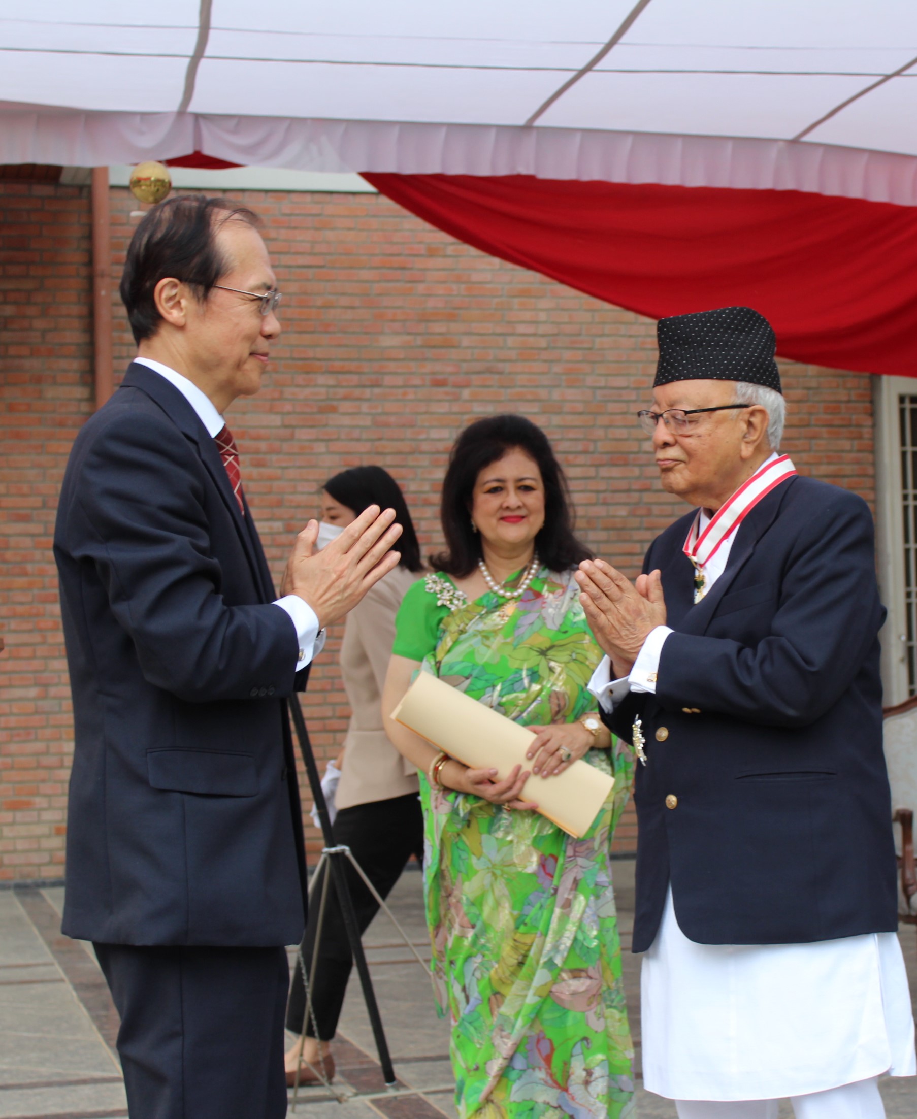 Ambassador Kikuta conveyed the decoration of the Order of Japan (The Order of the Rising Sun, Gold and Silver Star) to Mr. Rana, the founding governor of the Nepal Rastra Bank and former Finance Secretary, who opened the first foreign central bank account in the Bank of Japan in the 1960s.