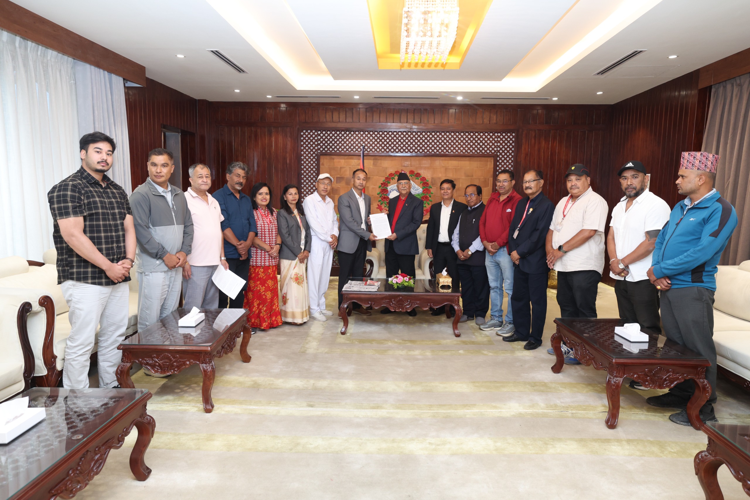 A delegation comprising Chairperson of Kathmandu Metropolis-22, Chinkaji Maharjan, and CPN (UML) Kathmandu District Committee Secretary Rajesh Shakya, among others, reached the official residence of the Prime Minister at Baluwatar today, and thanked the Prime Minister on the behalf of the locals for taking initiatives to construct a garden, numismatic and earthquake museum as well as the largest underground parking of the country in Sundhara and Dharahara area.
