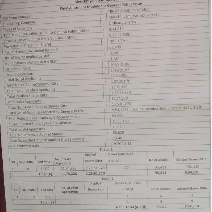 Kathmandu, April 26: Menchhiyam Hydropower Limited had issued 934,915 units worth Rs 9.34 crores as Initial Public Offering (IPO) to the general public (Baisakh 4- 7, 2080).