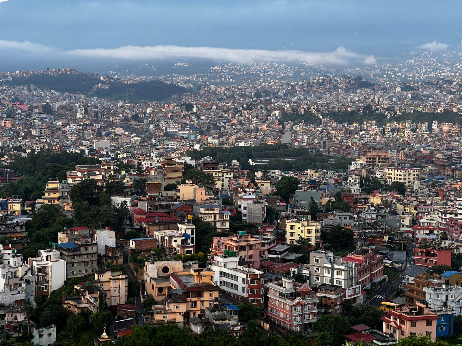 Kathmandu, July 14: As the monsoon nears its end in Asar (mid-July), most parts of the Kathmandu valley remain mostly blanketed in clouds. Even the eastern region of Kathmandu is covered by dense cloud layers. However, the western area, home to the UNESCO World Heritage Site of Swayambhu, opened up this morning.