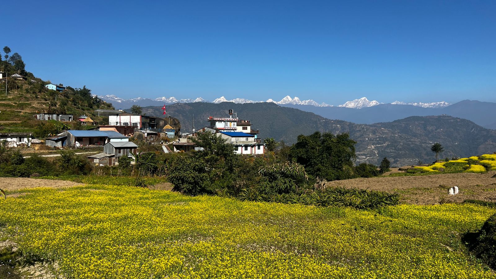 Every year around November/December, this magical scene attracts both locals and domestic tourists. The terraced fields are covered with blooming mustard flowers, and right behind them, the northern skyline opens up to the Ganesh Himal, Langtang, and Dorje Lakpa ranges — making the landscape look even more breathtaking.