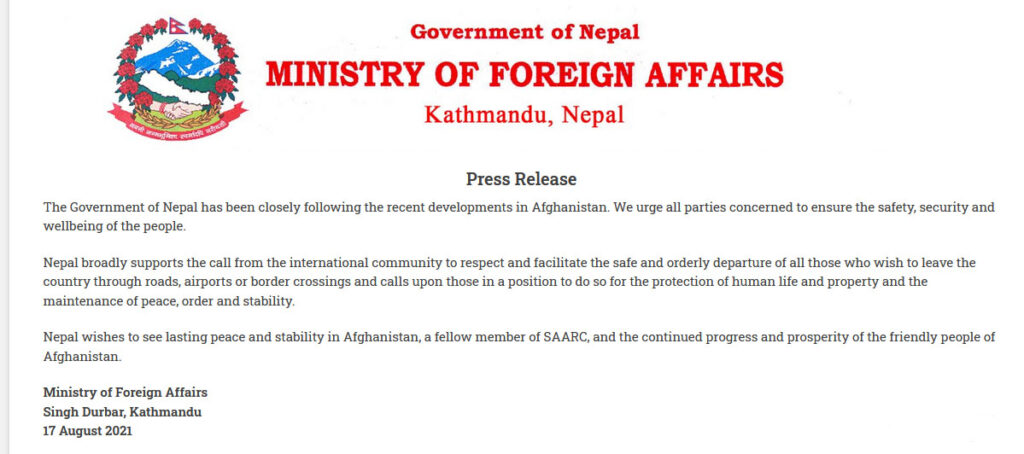 “Nepal broadly supports the call from the international community to respect and facilitate the safe and orderly departure of all those who wish to leave the country through roads, airports or border crossings and calls upon those in a position to do so for the protection of human life and property and the maintenance of peace, order and stability,” according to the Ministry of Foreign Affairs.