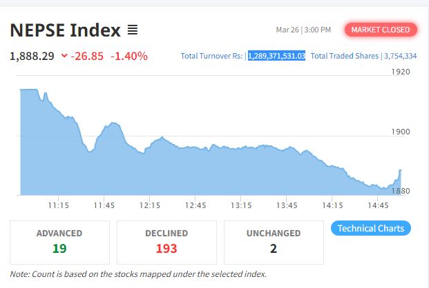 Kathmandu, March 26: The NEPSE index, which measures share turnover in the securities market, has fallen by double digits on Suday. According to the Nepal Stock Exchange, the NEPSE index fell by 26.85 points and was limited to 1888.29 points.