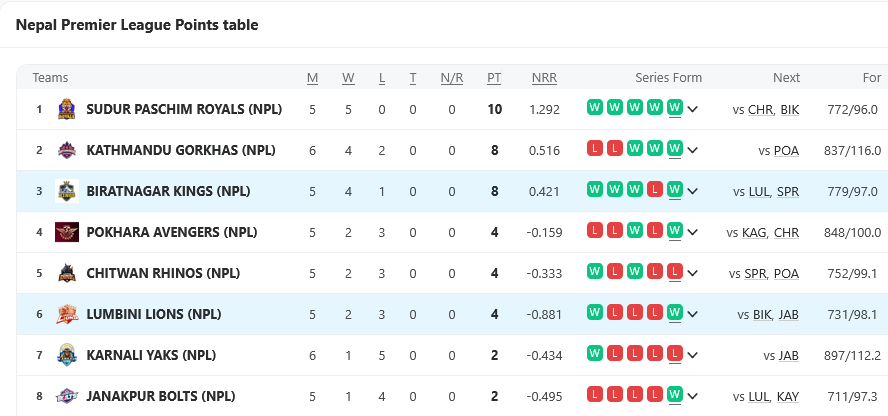 Biratnagar Kings, led by Sandeep Lamichhane, have collected eight points from five matches, maintaining a strong position in the league. Meanwhile, Lumbini Lions, captained by Rohit Kumar Paudel, have secured only two wins from their five matches.