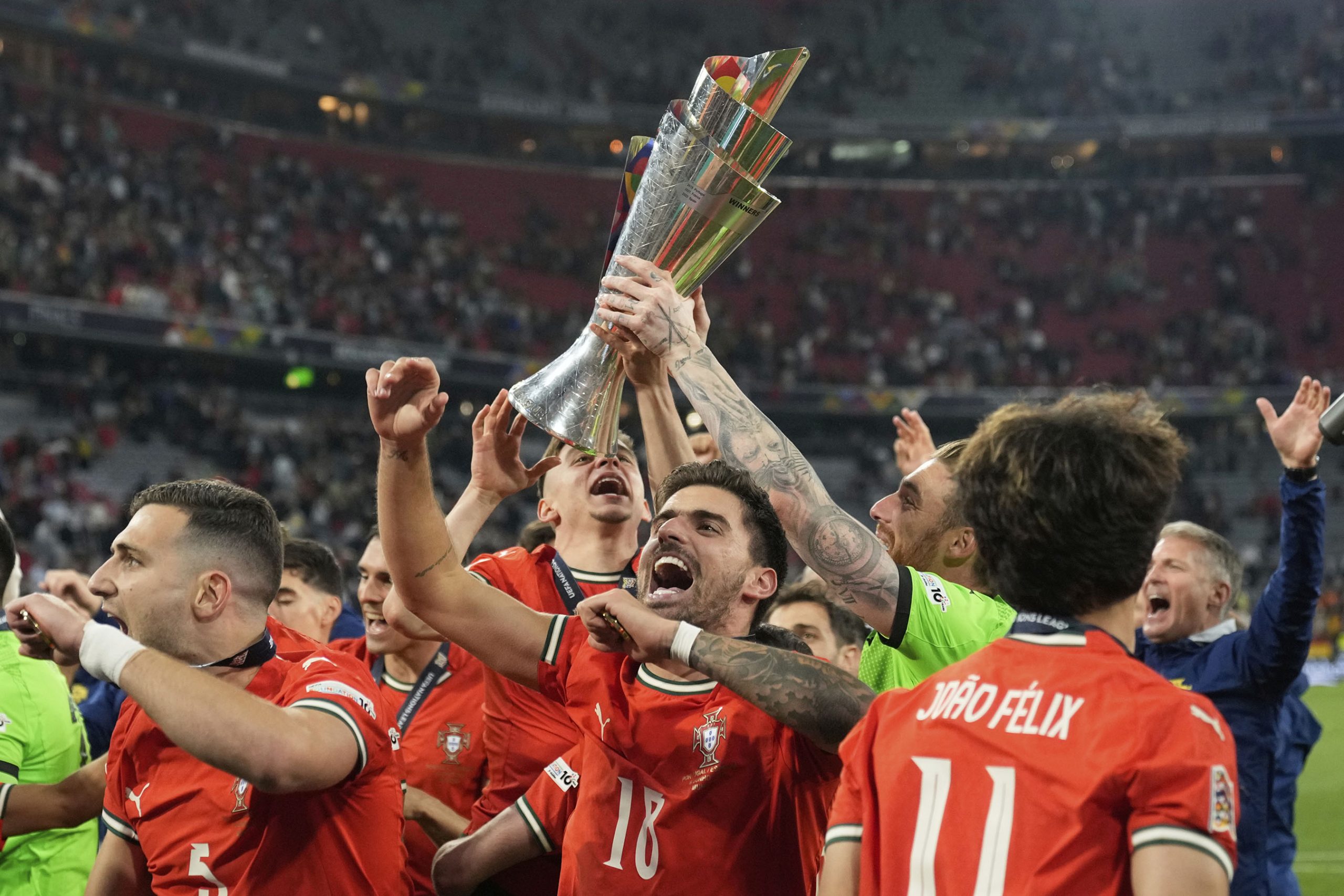 For Mendes and Paris Saint-Germain teammates Gonçalo Ramos, João Neves and Vitinha, it was their second trophy in a little more than a week after winning the Champions League in the same stadium. #portugal #ronaldo #UEFA #NationsLeague