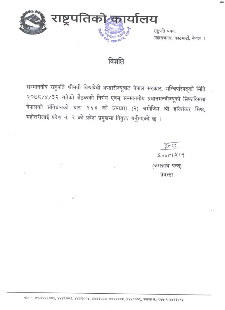A meeting of the Council of Ministers had recommended Hari Shankar Mishra of Sarlahi for the post of State Chief.
