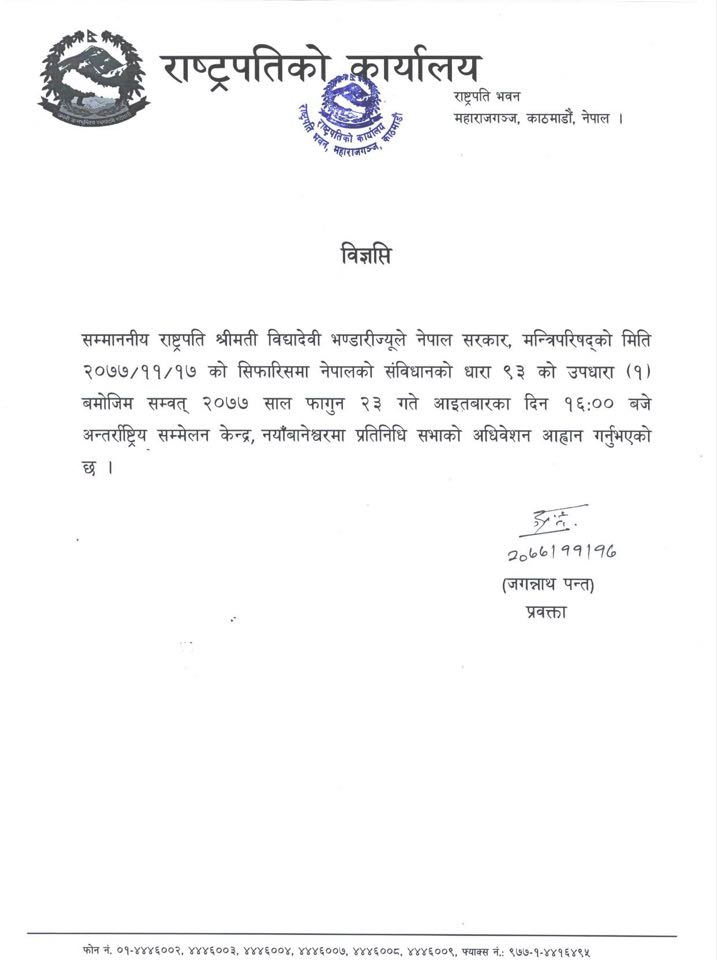 KATHMANDU: President Bidya Devi Bhandari has, on the recommendation of the Council of Ministers, summoned a session of the House of Representatives (HoR) for March 7.