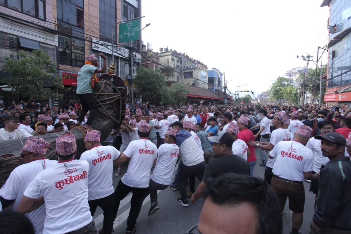The chariot was pulled from Pulchowk to Ga:bahal on Tuesday. The chariot is taken on a procession through various locations in Patan. It passes through Pulchowk, Ga:bahal, Sundhara towards Mahabouddha, Chaku Bahal, then on to Lagankhel, Podedole, and Jawalakhel.