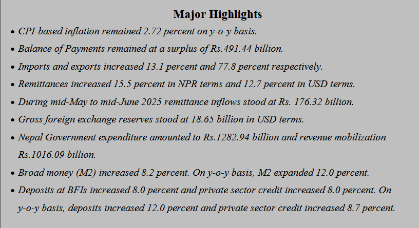 Of the total foreign exchange reserves, the reserves held by NRB increased 23.0 percent to Rs.2274.47 billion in mid-June 2025 from Rs.1848.55 billion in mid-July 2024. Reserves held by banks and financial institutions (except NRB) increased 53.2 percent to Rs.294.92 billion in mid-June 2025 from Rs.192.55 billion in mid-July 2024. The share of Indian currency in total reserves stood at 20.5 percent in mid-June 2025.