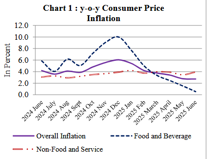 The y-o-y consumer price inflation stood at 2.72 percent in mid-June 2025 compared to 4.17 percent a year ago. Food and beverage inflation stood at 0.54 percent whereas non-food and service inflation stood at 3.94 percent in the review month. During the same period in the previous year, the price indices of these groups had increased 5.85 percent and 3.07 percent, respectively.
