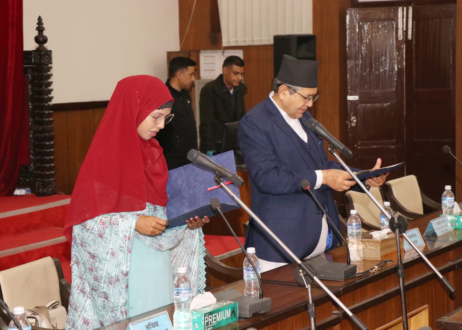 Speaker Ghimire administered the oath to Khan amidst a programme organized at the Parliament Secretariat in Singha Durbar today. On the occasion, the Speaker handed the Parliament’s logo to Khan and congratulated her on her election as the Member of Parliament.