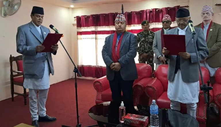 Hetauda: Bagmati Province Assembly newly elected Speaker Bhuwan Kumar Pathak took an oath of office and secrecy. He took the oath before Province Chief Yadav Chandra Sharma today in accordance with the sub-rule 8 of PA regulations-2074 BS. He, the candidate from the Rastriya Prajatantra Party, secured 62 votes in